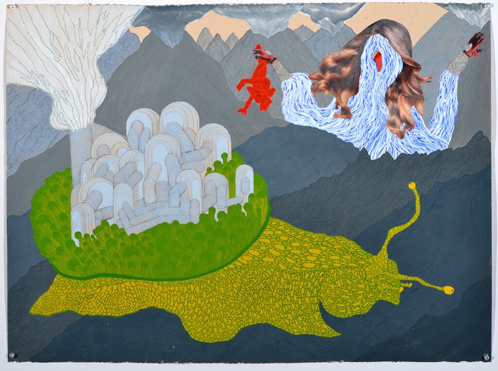 Snail on a Slope, Gouache, graphite & collage on cotton paper, 22.25H x 30W" 2024